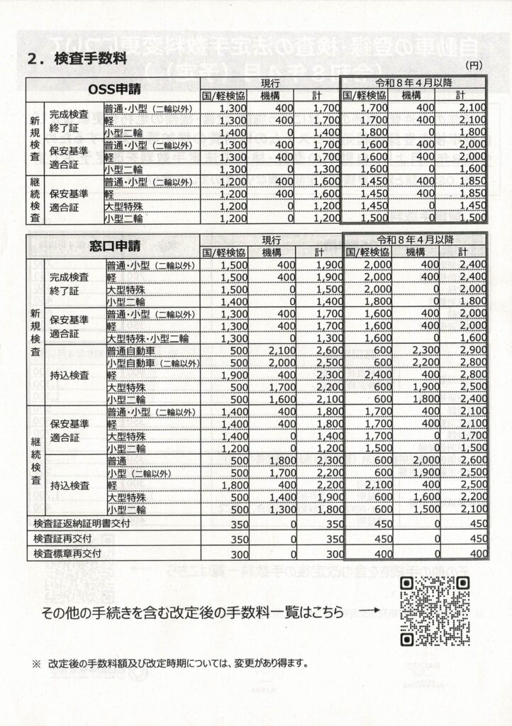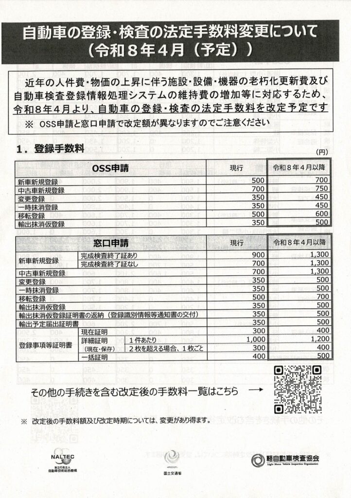 令和8年4月から、自動車の登録・検査の手数料が改定される予定です。